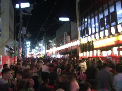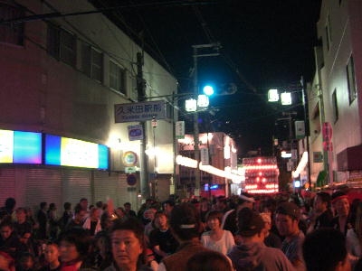 夜の曳行でも、昼みたいにだんじりがひっきりなしに